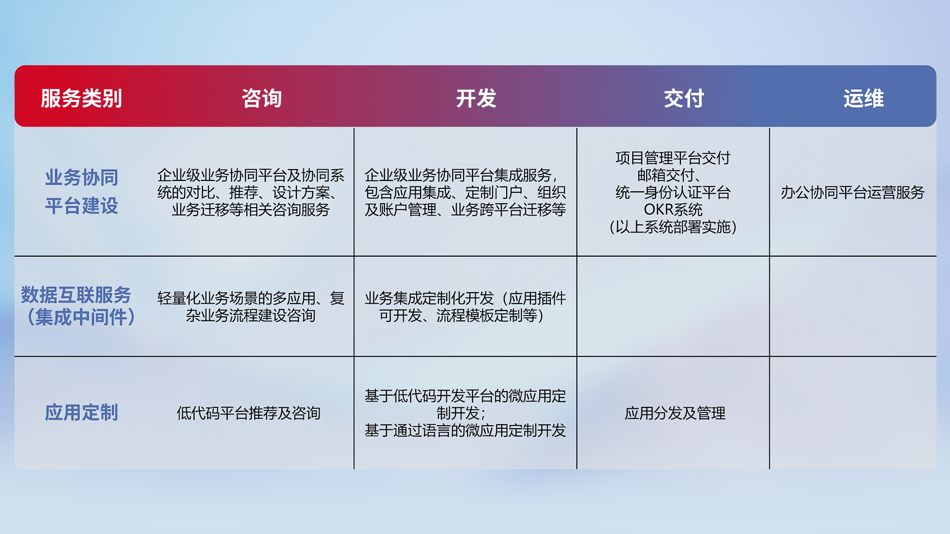 针对钉钉、、企微、、、、IDaas等平台级产品提供产品的规划、、方案、、、交付、、、、定制化开发等服务,,,实现如统一协同办公、、、智能客户服务、、混合会议管理、、、智能数据查询、、、等业务场景,,,实现数字化转型。。。。
