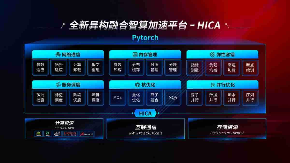 通过自研的服务层、、、中间适配层、、、以及调度编排算法,,,,采用数据并行、、、模型并行等多种并行方式,,,把并行计算任务进行有效的分解,,,,使其分别由相应的软件栈和算力资源来承接。。当GPU资源变化,,HICA可以实时动态调度计算子任务并调整模型拓扑和架构,,以充分聚合各种算力资源。。。