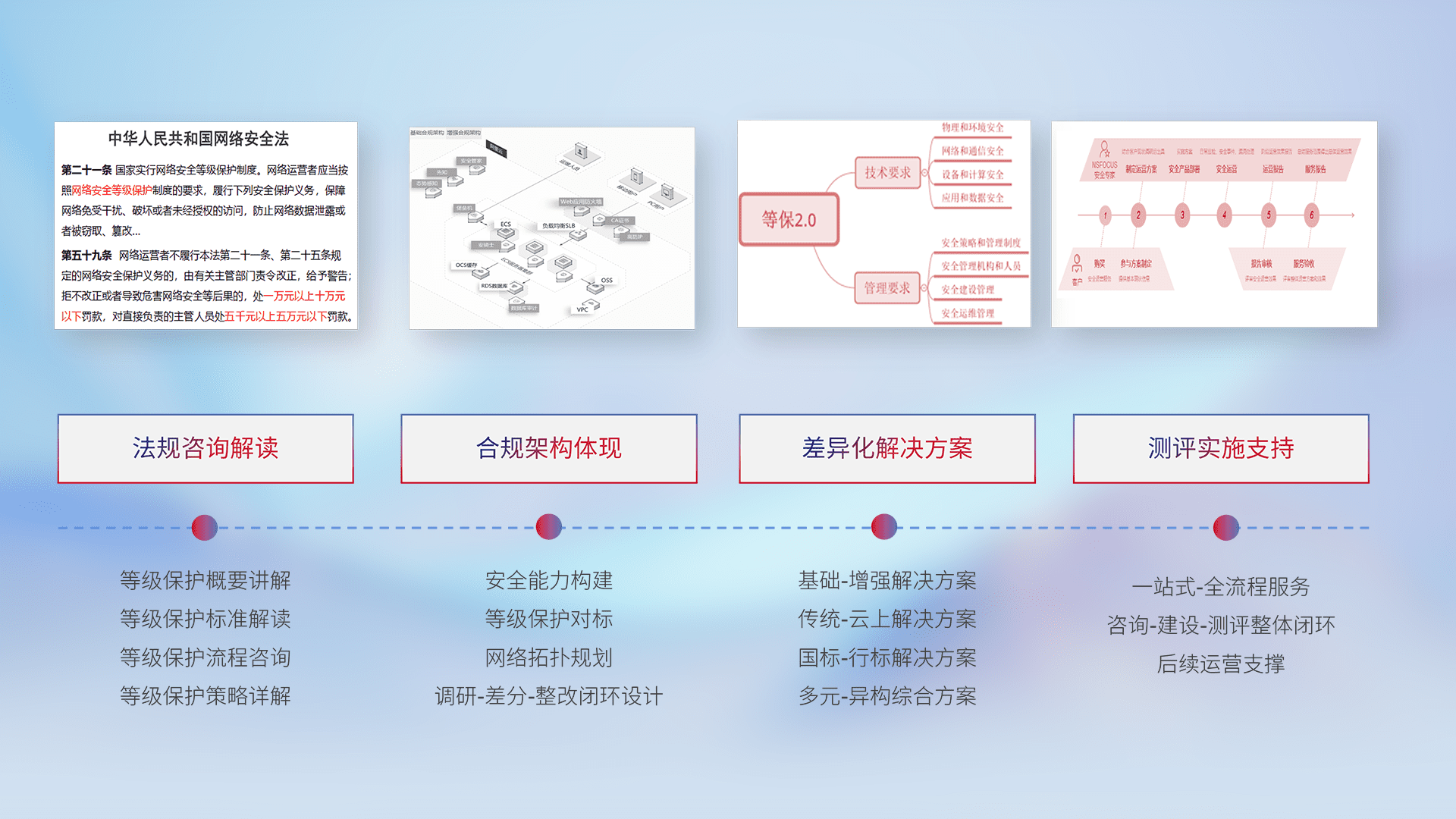 通过专业的法律咨询解读、、、、合规架构体现、、、差异化解决方案、、测试实施支持等服务,,,为客户量身打造等保合规体系。。。。